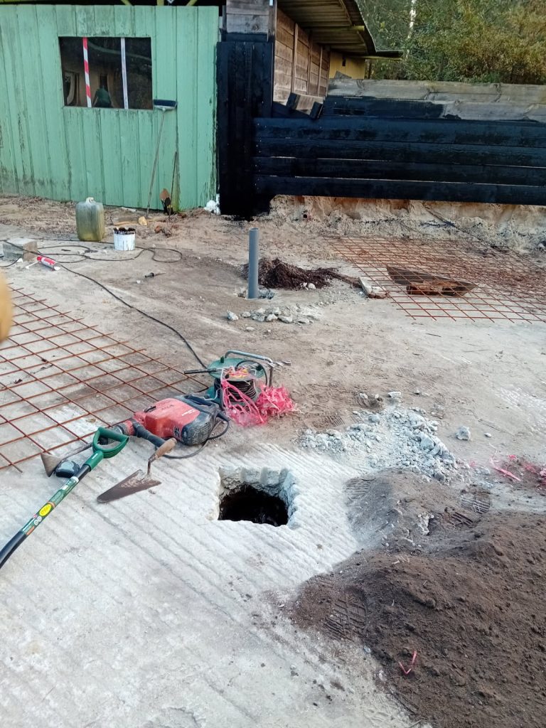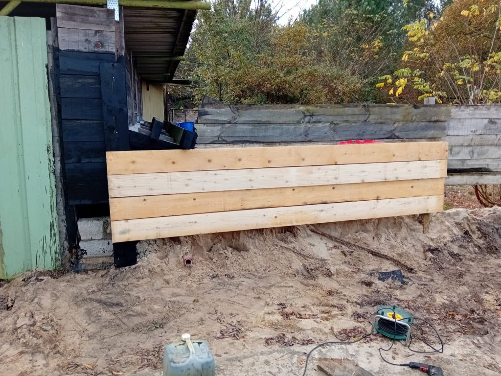 Suite des travaux 13 novembre 2025 On est chez nous Préparation des support des poteaux démontables Fortification des parre-balles latéraux